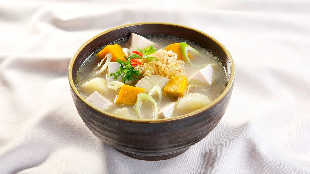 - Bước 2: Cho 1.2 lít nước vào đun sôi, cho khoai mì vào nấu chín tới, cho tiếp bí đỏ và đậu hũ vào vào, nêm 1.5M Hạt nêm Aji-ngon® Nấm, 1/2m muối, 1/2m đường, 1/2m Bột ngọt AJI-NO-MOTO® và ít tiêu, nếm vị vừa ăn, cho hành boaro cắt xéo, rau om, ngò gai vào, tắt lửa.