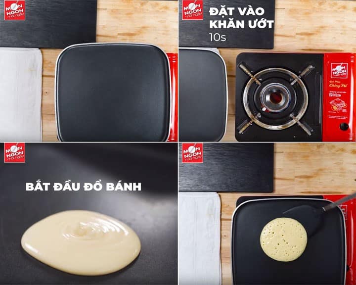 - Đầu tiên, Mẹ đặt chảo trên bếp cho nóng, sau đó lấy ra đặt lên khăn ướt khoảng 10 giây rồi đặt chảo lại lên bếp
