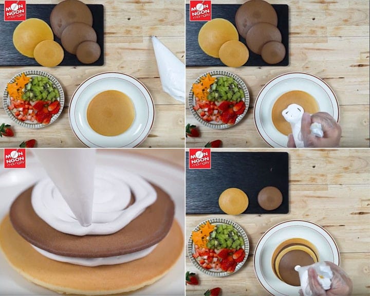 Đặt một miếng bánh rán có kích thước lớn nhất lên dĩa, quét một lớp Whipping cream lên trên mặt bánh, sau đó đặt một bánh rán vị socola có kích thước nhỏ hơn lên trên rồi một lớp Whipping cream. Tiếp tục xếp xen kẽ 2 loại bánh cùng với lớp Whipping cream cho đến khi hết bánh.