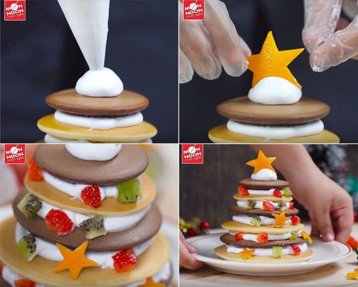 Sau khi đã xếp hết bánh, cho một ít Whipping cream trên đỉnh bánh rồi đặt một miếng vỏ cam vàng hình ngôi sao lên trên cùng.