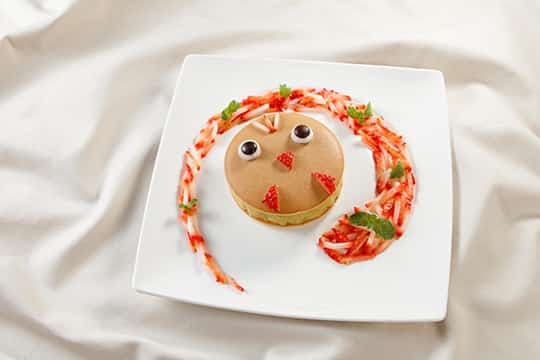Cho nhân khoai vào kẹp giữa 2 bánh rán, xếp lên dĩa, trang trí với dâu tây.