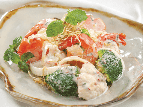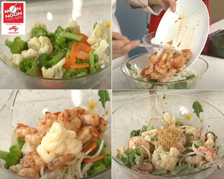 - Trộn đều bông cải, cà rốt, hành tây, tôm và húng lủi với 3M Xốt Mayonnaise Aji-mayo® Vị Nguyên Bản.