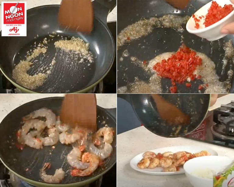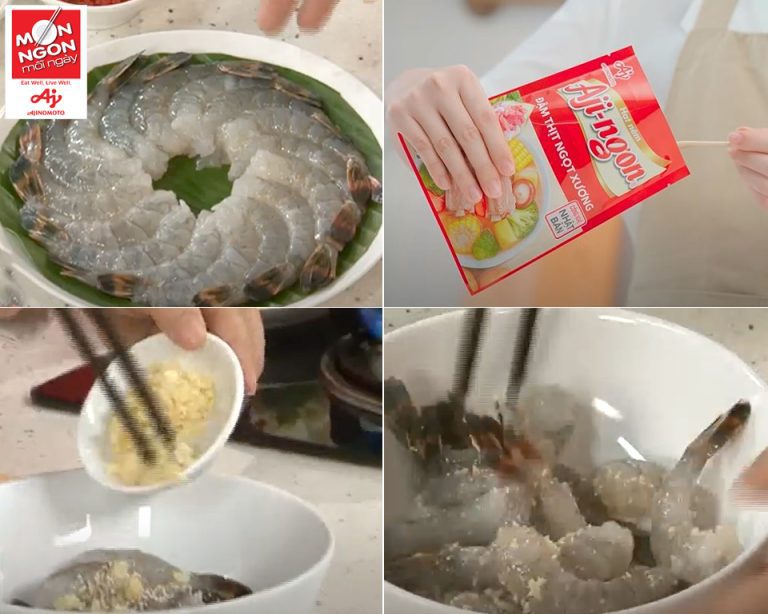 - Tôm sú ướp 1/2 m Hạt nêm Aji-ngon®, 1/3m tiêu, 1m ỏi băm, để thấm.