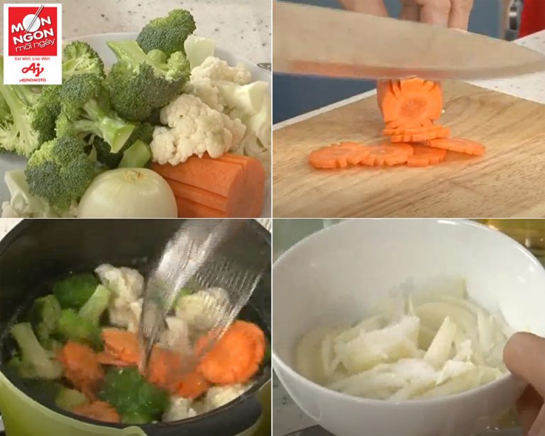 - Bông cải tách miếng vừa ăn, rửa sạch. Cà rốt tỉa hoa, cắt lát mỏng. Luộc chín bông cải và cà rốt trong nước có ít muối, vớt ra cho vào tô nước đá đợi nguội, sau đó để ráo nước.
