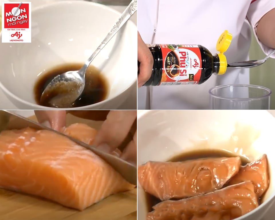 - Cá rửa sạch, thấm ráo nước, ướp cá với 1M rượu trắng, 1M đường, 1M nước gừng và 2M Nước tương “Phú Sĩ”, để thấm 15 phút.
