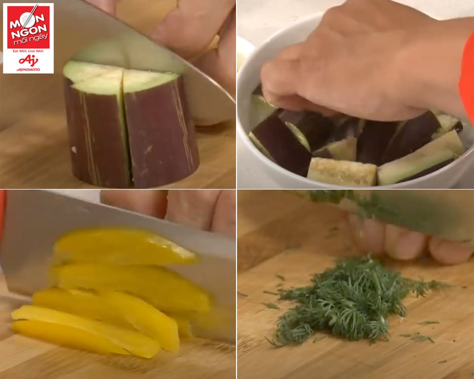 - Cà tím cắt miếng 2x3cm, ngâm nước pha chút muối. Ớt sừng cắt miếng cạnh 1cm. Ớt chuông vàng cắt sợi tròn bản 0.5cm. Thì là cắt nhuyễn.