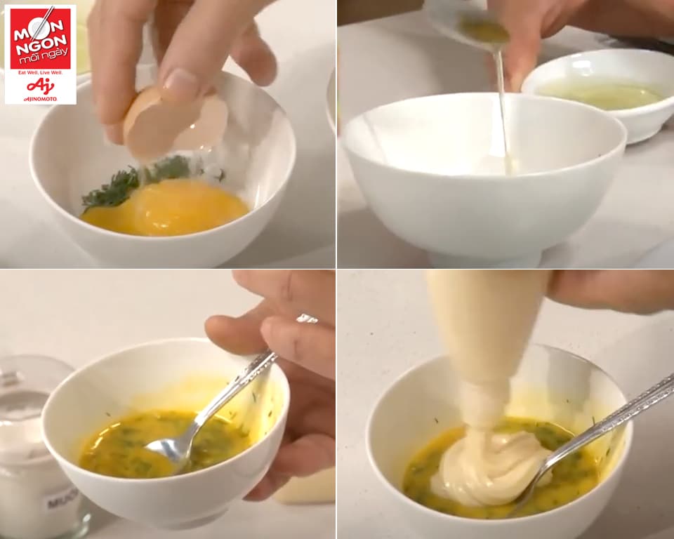 - Pha xốt: Trộn đều 2 lòng đỏ trứng, thì là, 1/2m nuớc cốt chanh và 2M Xốt Mayonnaise Aji-Mayo®.