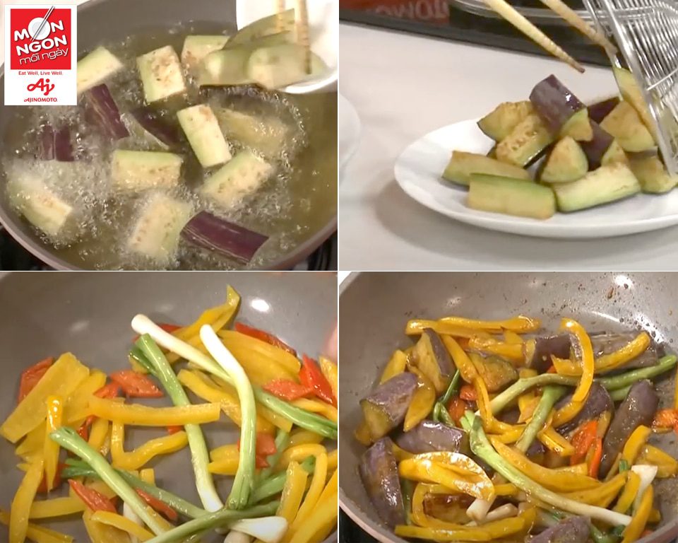 - Xào rau: Chiên cà tím trong dầu ngập đến khi chín vàng, vớt ra riêng để ráo dầu. Chừa lại một ít dầu trong chảo, phi thơm đầu hành, ớt sừng, ớt vàng, cho cà tím vào xào, thêm 2M nước tương “Phú Sĩ”, 1m Hạt nêm Aji-ngon®, 1M đường, 1M rượu trắng, xào đến khi xốt cạn thấm vào cà.