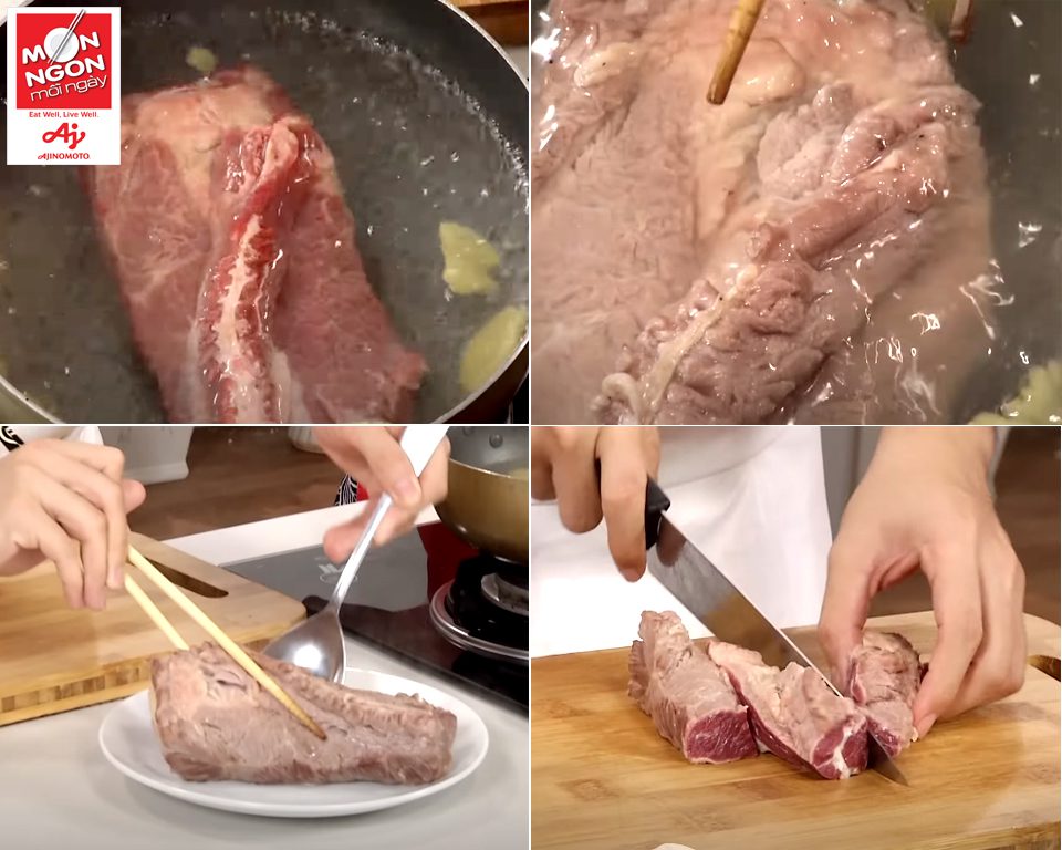 - Ướp thịt bò với 1M tỏi băm, 1/2m Hạt nêm Aji-ngon® Heo, 1m đường, 1m ngũ vị hương, 4M rượu vang để thấm 30 phút