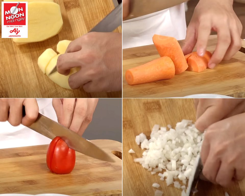 - Cà chua cắt múi cau. Hành tây băm nhỏ. Khoai tây, cà rốt cắt khối vừa ăn. Ngò gai khúc 2cm.