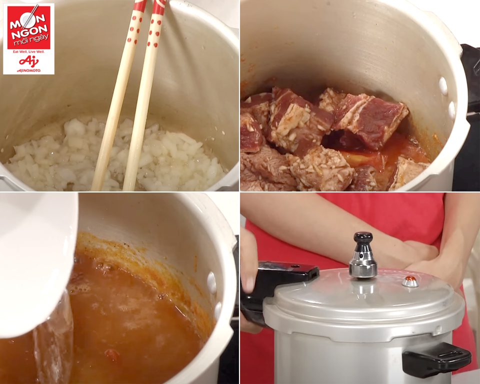 - Đặt nồi áp suất lên bếp, đun nóng dầu, cho hành tây vào phi thơm, cho cà chua và cà chua hộp vào xào đến khi cà chua chín mềm, cho bơ, thịt bò xào săn, thêm 4M rượu vang, cho nước vào ngập thịt, đậy nắp, nấu trong 7 phút.
