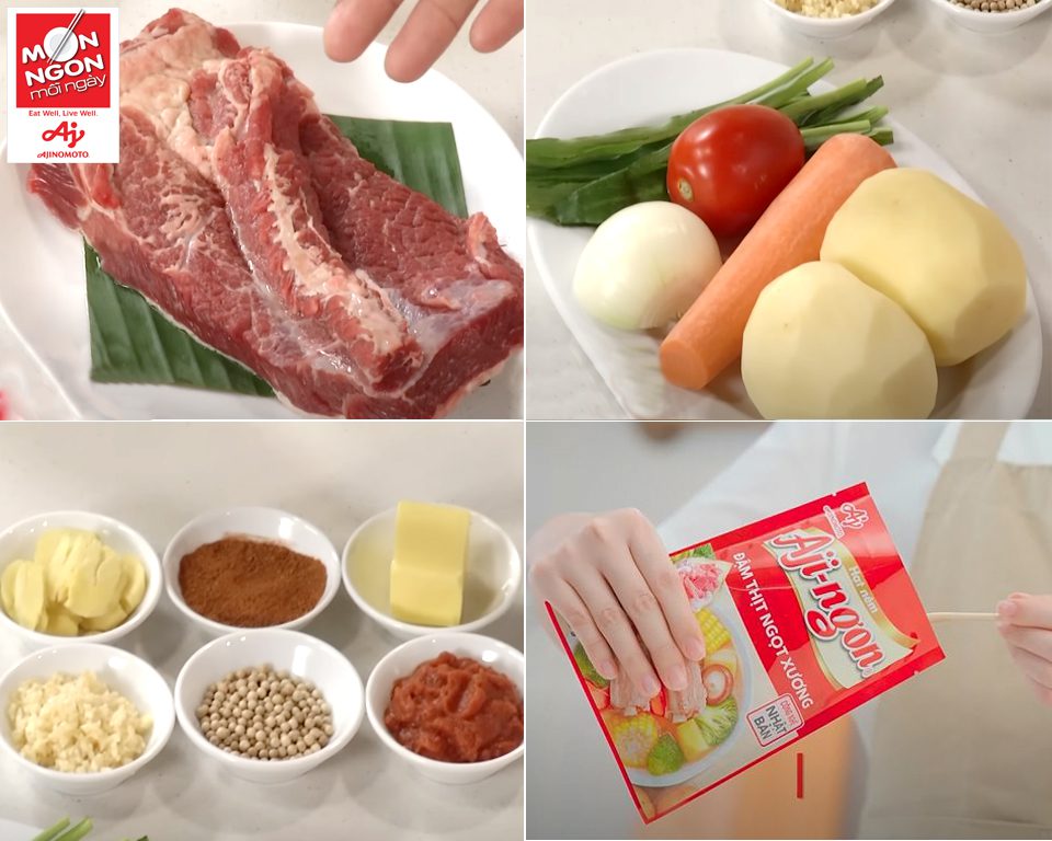 Thịt bò nạm sườn : 500g • Hành tây : 1/2 củ • Khoai tây : 2 củ • Cà rốt : 1 củ • Cà chua chín đỏ : 1 quả • Gừng đập dập : 1 củ • Cà chua hộp : 50g • Tỏi gừng băm • Rau ngò gai • Rượu vang đỏ : 100g • Gia vị: Ngũ vị hương, bơ lạt Muối, đường, tiêu hạt, Hạt nêm Aji-ngon® Heo