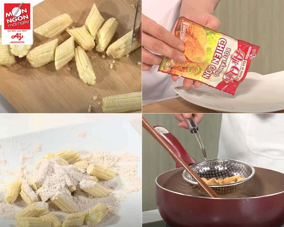 - Áo đều bột Gia vị nêm sẵn Aji-Quick® Bột tẩm khô chiên giòn bên ngoài bắp.
