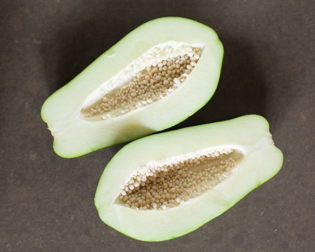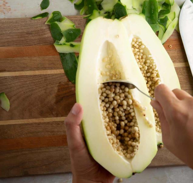 - Bổ đu đủ làm đôi, rồi bỏ hết phần ruột và hạt bên trong.
