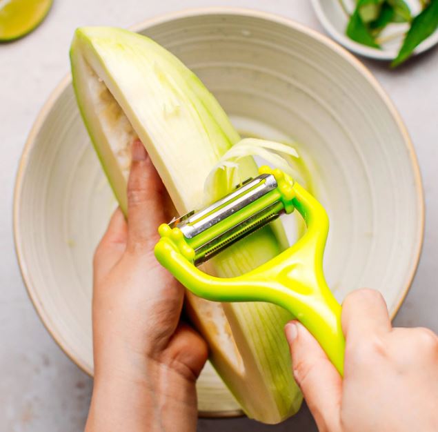 Cạo sát và loại bỏ hết phần vỏ xanh của trái đu đủ – Ảnh: hungryinthailand