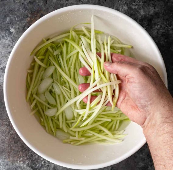 Bào sợi đu đủ thật mỏng sau đó đem ngâm muối để loại bỏ bớt nhựa – Ảnh: fullofplants