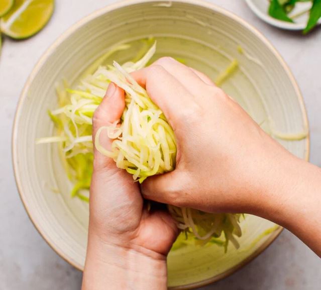 Sau khi ngâm hãy vắt đu đủ thật kĩ để giảm độ mặn của muối và bỏ bớt nhựa – Ảnh: fullofplants