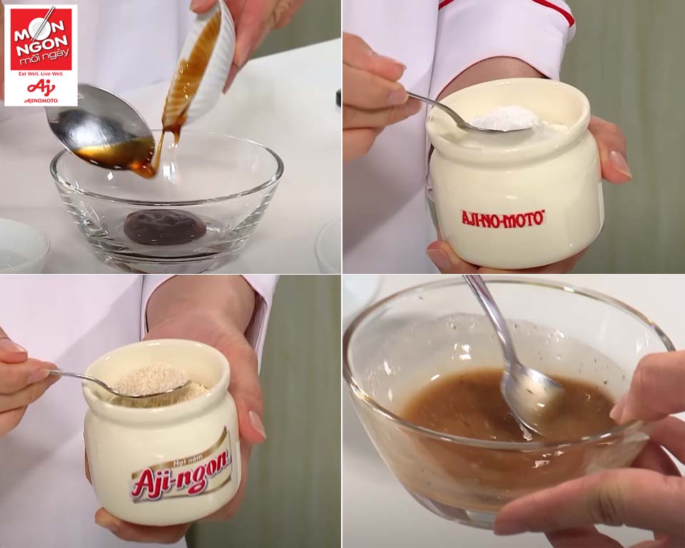 - Khuấy đều 1/2m đường, 1.5m Hạt nêm Aji-ngon® Heo, 1/2m Bột ngọt AJI-NO-MOTO®, 1/2m tiêu, 1M dầu hào, ít rượu trắng và 1M nước.