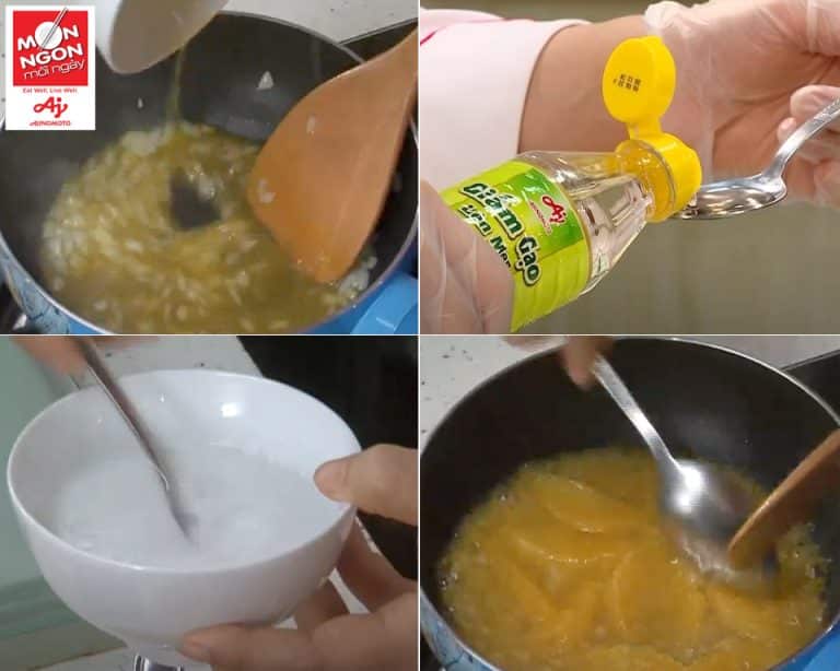 - Làm xốt cam: Xào thơm hành tây với ít dầu, cho nước bột cam vào đun sôi, nêm 1M đường, 1M Giấm gạo lên men Ajinomoto, 1/2m muối, 1m bột năng pha loãng khuấy đều cho xốt hơi sệt lại, thêm tép cam, nếm vị chua ngọt vừa ăn.
