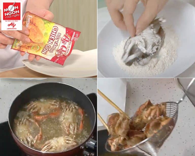 - Đun nóng dầu ăn, tẩm cua với 1 gói Gia vị nêm sẵn Aji-Quick® Bột tẩm khô chiên giòn sau đó đem chiên chín vàng, vớt ra để ráo dầu.