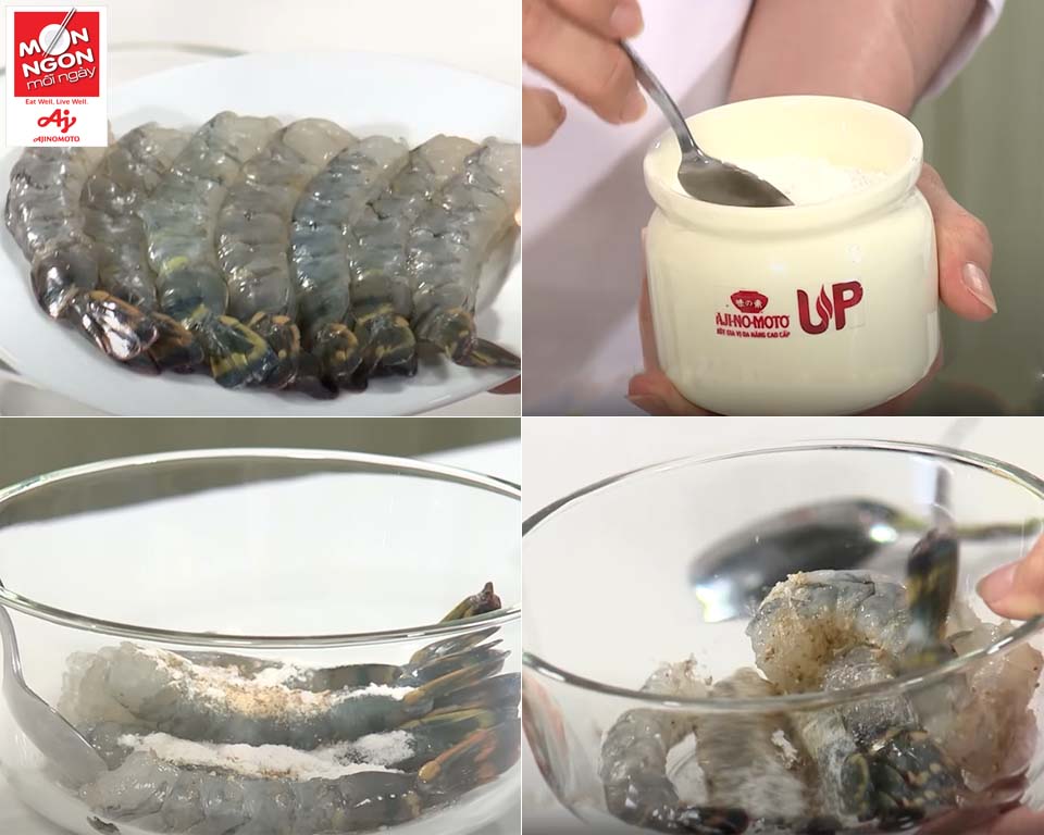 - Ướp tôm với ít muối tiêu, Bột ngọt AJI-NO-MOTO®.