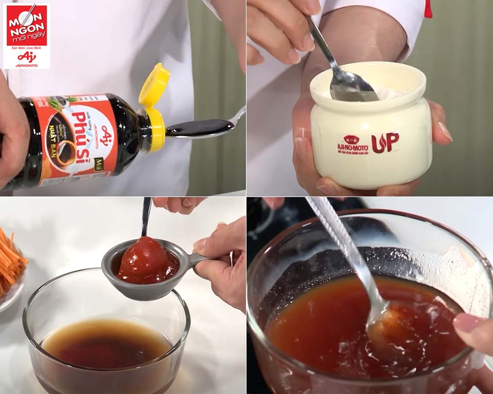 - Trộn đều 1M Nước tương “Phú Sĩ”, 1/2m Bột ngọt AJI-NO-MOTO®, 1/2m đường, 1M tương cà, 1m tương ớt.