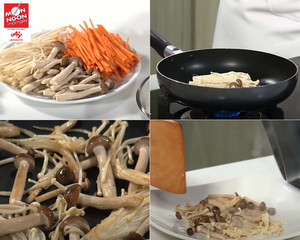 - Áp chảo không dầu 2 loại nấm đến khi chín.