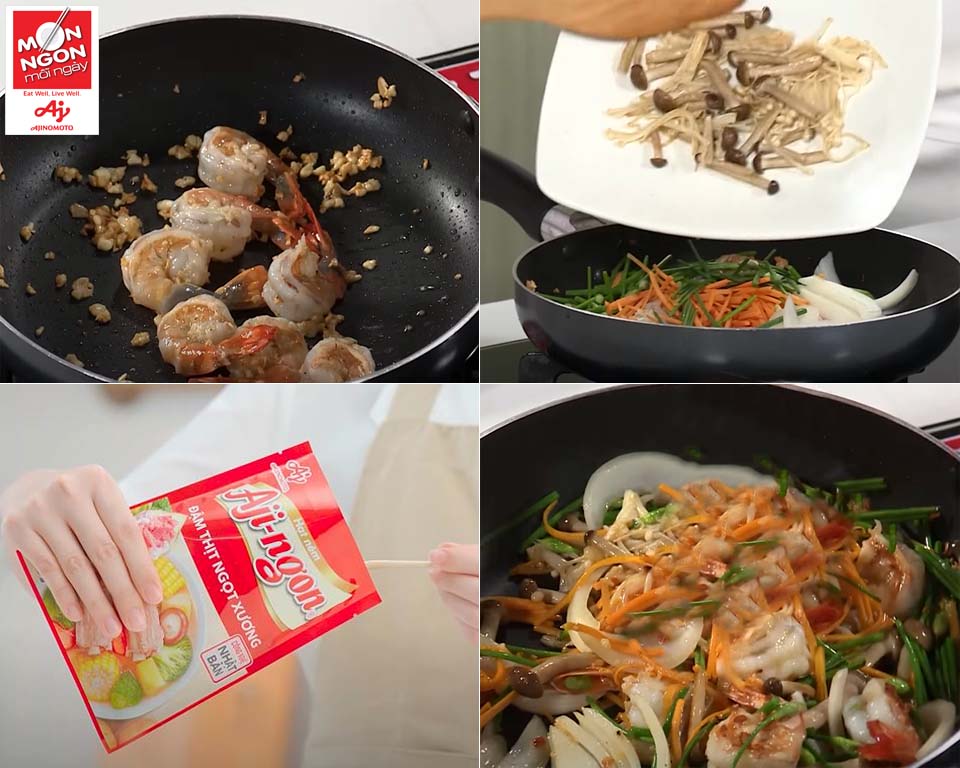 - Tiếp tục thêm hành tây, bông hẹ, cà rốt, nấm vào xào chín; nêm 1m Hạt nêm Aji-ngon® Heo.