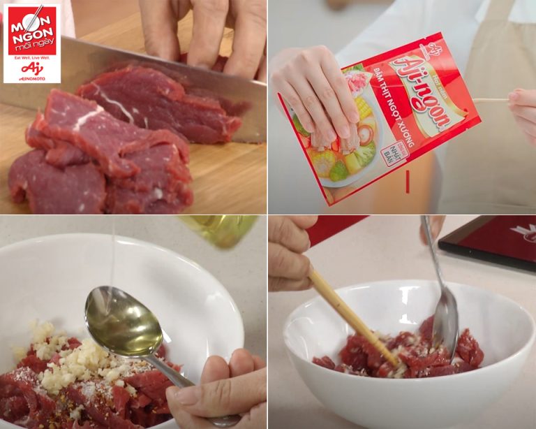 • Thịt bò ướp 1/2m Hạt nêm Aji-ngon® , 1/2m đường, 1M dầu ăn, 1/3m ớt bột, 2m tỏi băm, để thấm.