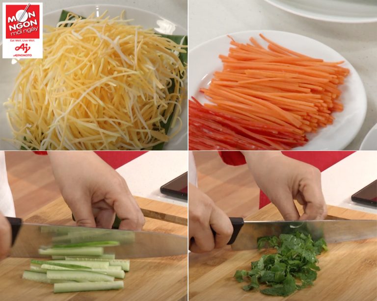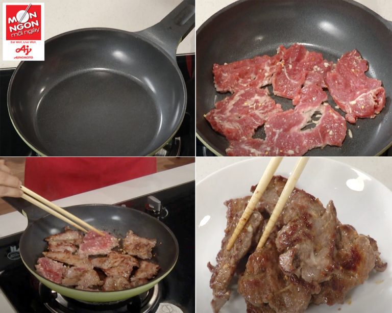 • Áp chảo thịt bò chín tái, cắt miếng dài vừa ăn.