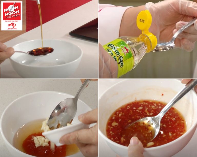 • Pha nước trộn: 2M đường, 1M nước mắm, 1/2m muối, 1/2m Bột ngọt AJI-NO-MOTO®, 2M tương ớt, 3M Giấm gạo lên men Ajinomoto, khuấy tan, thêm 1M tỏi ớt băm.
