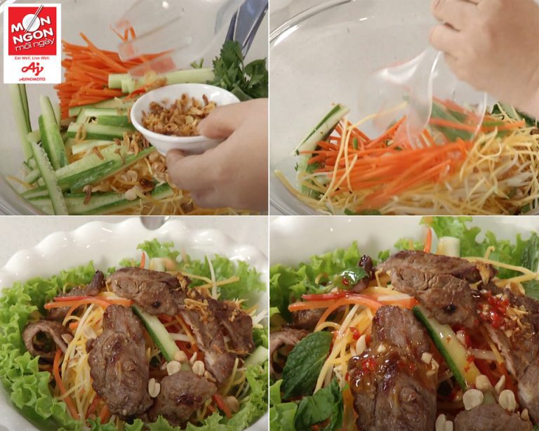 Món ăn vặt ngon tuyệt đảm bảo các con bạn sẽ thích mê ngay! Nếu lo lắng con yêu ăn vặt bên ngoài không đảm bảo vệ sinh, hãy tự tay chuẩn bị món gỏi đu đủ yêu thích cho con cùng chút sáng tạo với thịt bò để tăng độ dinh dưỡng cho món ăn. Thịt bò mềm, thấm vị, đu đủ giòn, hơi chua thanh từ Giấm gạo lên men Ajinomoto và cay nhẹ hấp dẫn vị giác có lẽ sẽ khiến con yêu “chán” ăn vặt mà ăn nhà nhiều hơn đấy!