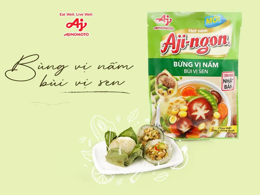 - Nêm nếm gia vị đúng cách: Món chay ngon không chỉ đến từ nguyên liệu tươi mà còn ở cách nêm nếm khéo léo để giữ được vị ngọt thanh tự nhiên. Bạn nên chọn lựa những loại gia vị được chiết xuất từ nấm, hạt sen thường để tạo nên vị đậm đà nhưng không lấn át hương vị rau củ. Trong đó, hạt nêm Aji-ngon® Nấm là một lựa chọn đáng cân nhắc nhờ hương vị dịu nhẹ, tinh tế, phù hợp cho các món canh, kho, xào chay.