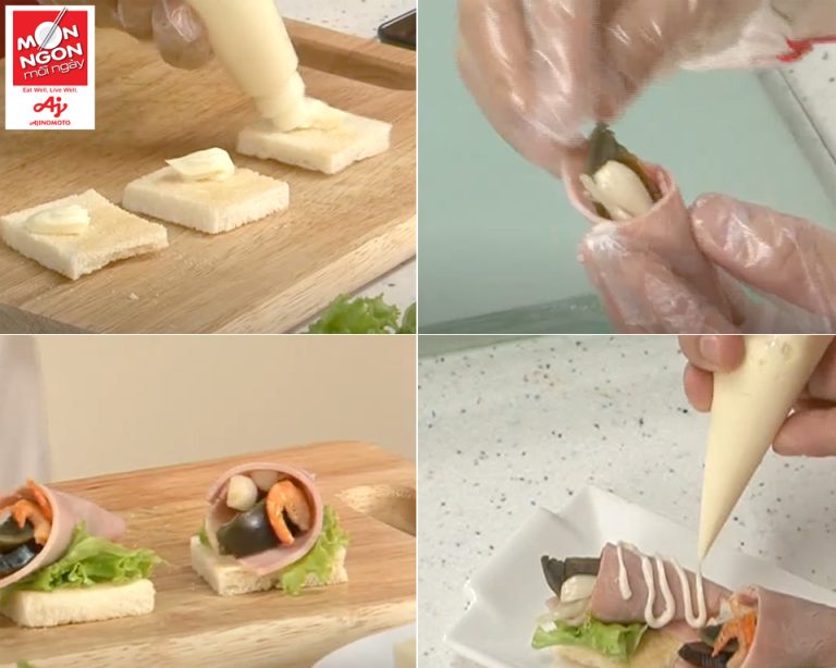 - Cuộn miếng thịt nguội thành hình loa kèn, cho trứng bắc thảo, tôm khô và củ kiệu vào trong. Phết 1 lớp mỏng xốt Mayonnaise LISA lên miếng sandwich, xếp lên 1 lá xà lách rồi đặt cuộn thịt nguội lên trên, bắt Xốt Mayonnaise Aji-mayo® Vị Nguyên Bản theo hình zic zac lên cùng, trang trí với 1 con tôm khô.