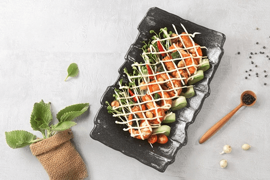 - Bước 3: Bày tôm rang, lá húng chanh ra dĩa cùng với rau mầm, dưa leo, cà chua bi, trang trí topping với Xốt Mayonnaise Aji-mayo® Vị nguyên bản.