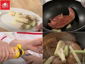*Lót sả ở đáy nồi, lưỡi heo ở trên để không bị cháy và không bị dính vào đáy nồi sau khi om.