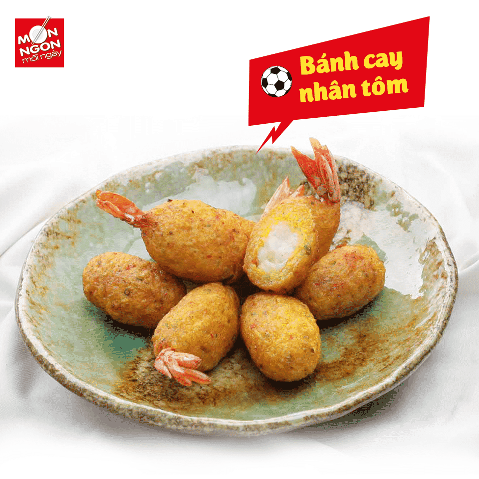 - Bước 3: Vê khoai mì thành viên tròn đường kính 3cm rồi nắn dẹp hình bầu dục, cho tôm vào, bọc kín lại như hình con nhộng. Sau đó lần lượt cho bánh cay vào chiên chín vàng, vớt ra để ráo dầu và khi ăn chấm cùng Xốt Mayonnaise Aji-Mayo®.