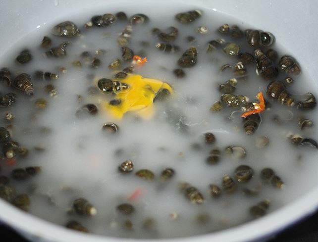 Ngâm ốc bươu với nước vo gạo sẽ giúp ốc nhả hết bùn đất và chất bẩn – Ảnh: vnexpress