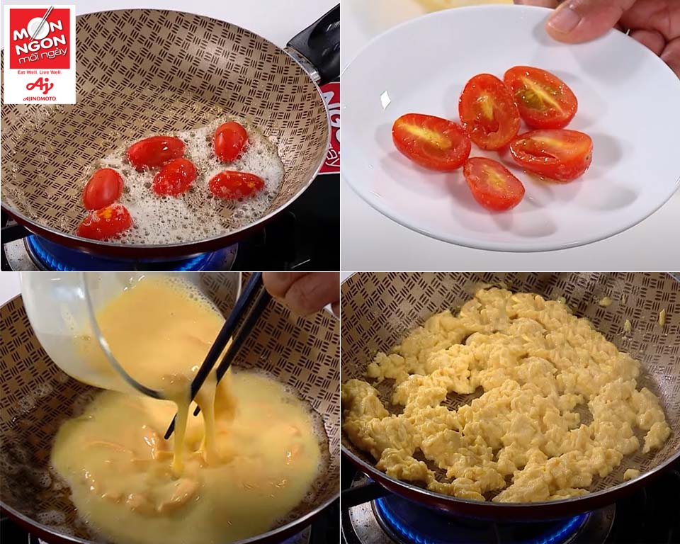 • Cho trứng khuấy một bên, đặt cà chua bi áp chảo trang trí thêm lá húng lủi.