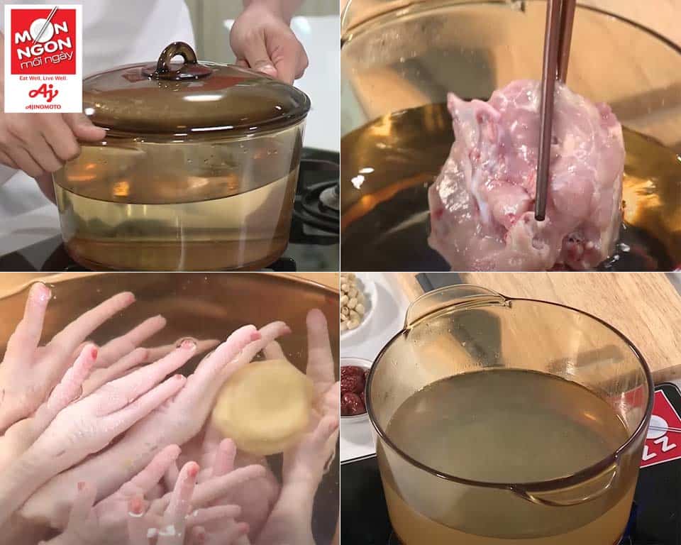 • Cho xương gà, chân gà, 2 lát gừng vào nồi có 3L nước, đun sôi khoảng 1 tiếng.
