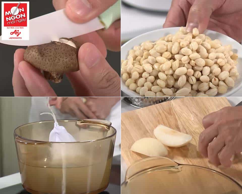 • Đâu phộng ngâm 4h bỏ vỏ, cho vào vải mùng (hoặc túi vải). Cho vào nồi nước dùng gà.