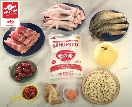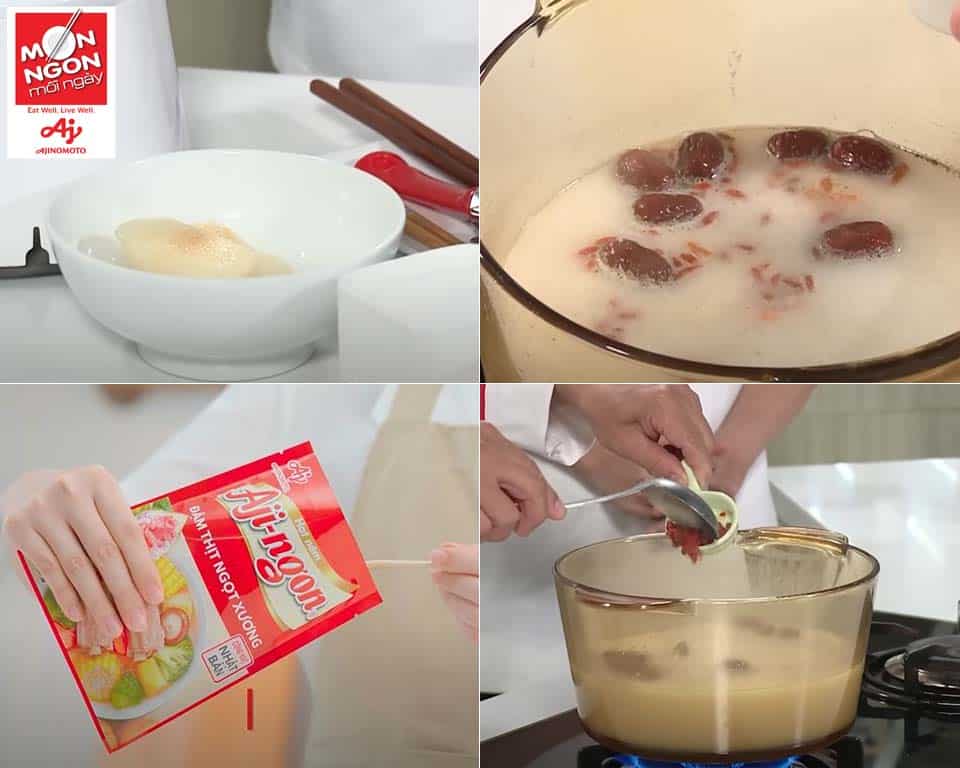 • Nêm 2g muối, 25g đường phèn, 25g Hạt nêm Aji-ngon® Heo, 25g Bột ngọt AJI-NO-MOTO® nấu chín.
