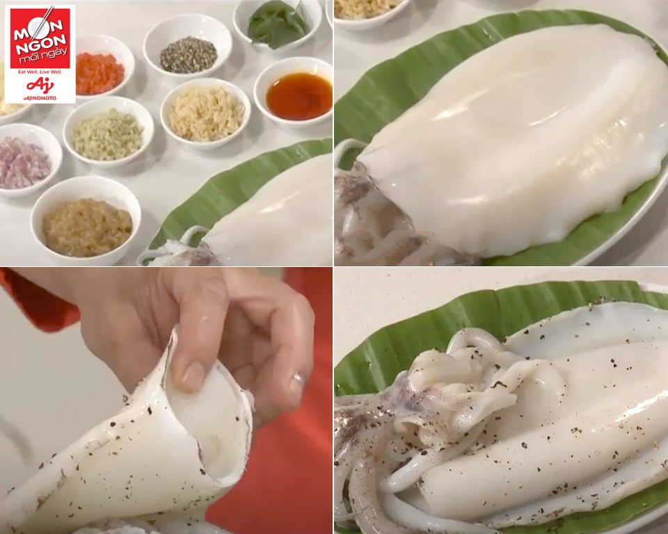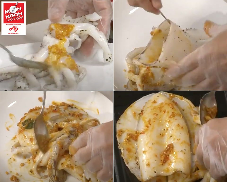 - Mực nguyên con, rửa sạch, để ráo, ướp 1 ít tiêu trong 5-10 phút.