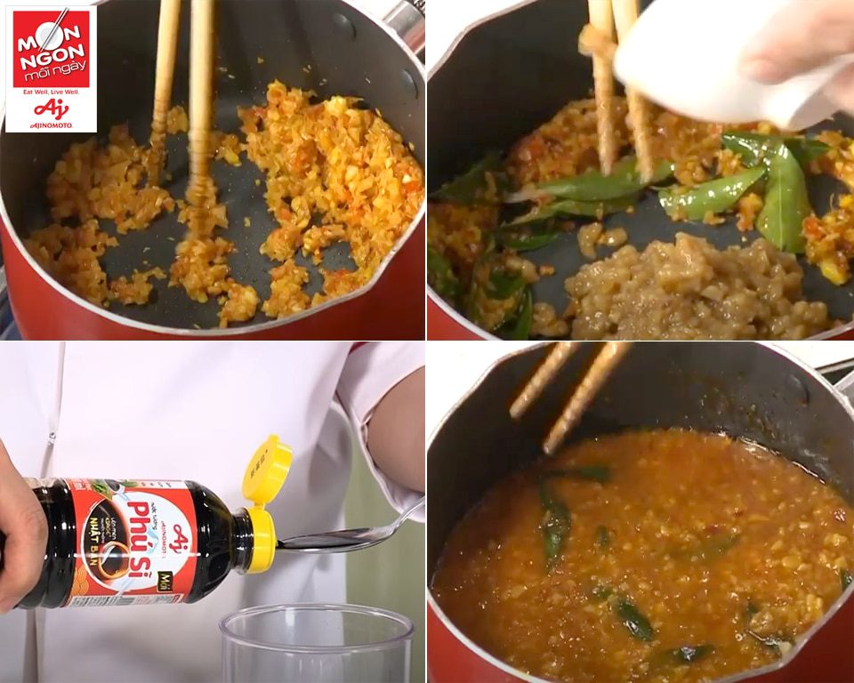 - Pha xốt ướp: Làm nóng 2M dầu điều, cho 2M hành tím băm, 2M tỏi băm, 1M sả băm, 2M ớt sừng băm, 2M gừng băm vào xào thơm, cho tiếp lá cà ri, tương hột băm nhuyễn (không nước) vào xào. Cho vào 1 chén nước dừa xiêm, nêm 2m Nước tương “Phú Sĩ”, 2m Bột ngọt AJI-NO-MOTO® đun lửa nhỏ đảo đều. Tắt lửa, để nguội.