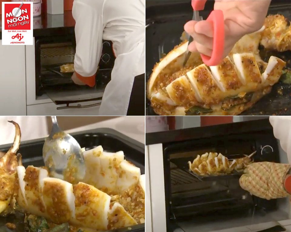 - Nướng mực bằng lò nướng nhiệt độ 185°C, sau 10 -15phút lấy mực ra, dùng kéo cắt theo chiều dọc con mực, sau đó cắt hai bên hông con mực. Cho vào lò nướng tiếp đến khi mực chín vàng.