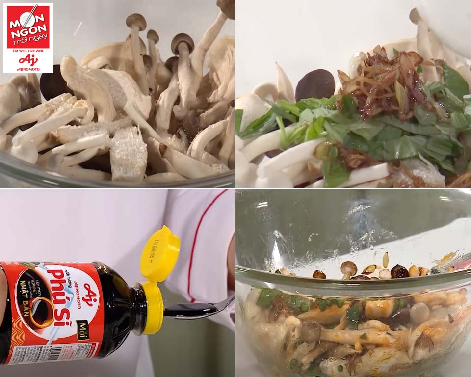 - Cho tất cả các loại nấm đã sơ chế vào tô.