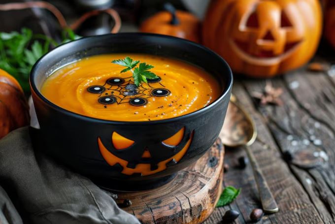 Súp bí ngô (Pumpkin Soup) cũng là món ăn truyền thống thể thiếu trong dịp Halloween. Được làm từ bí đỏ xay nhuyễn với nước dùng hoặc nước luộc. Tùy quốc gia và tùy theo khẩu vị thì súp bí đỏ có thể làm món nóng hoặc món lạnh. – Ảnh: freepik