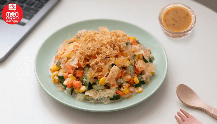 Chế biến: Trộn đều dưa leo, cà rốt, bắp hạt, bánh tráng nướng áp chảo đập nhỏ trộng đều với Xốt Mè Rang “Aji-Xốt”.