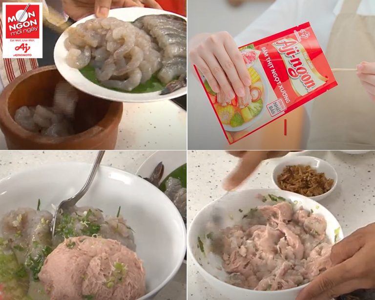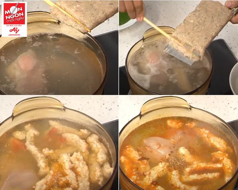 - Chả tôm dùng đũa nhúng dầu và tạo hình con đuông rồi cho vào nồi nước dùng. Thêm tôm sú, 1m đuòng phèn, 1m hạt nêm Aji-ngon®, 1/2m muối, 1m màu điều, 1M nước mắm.