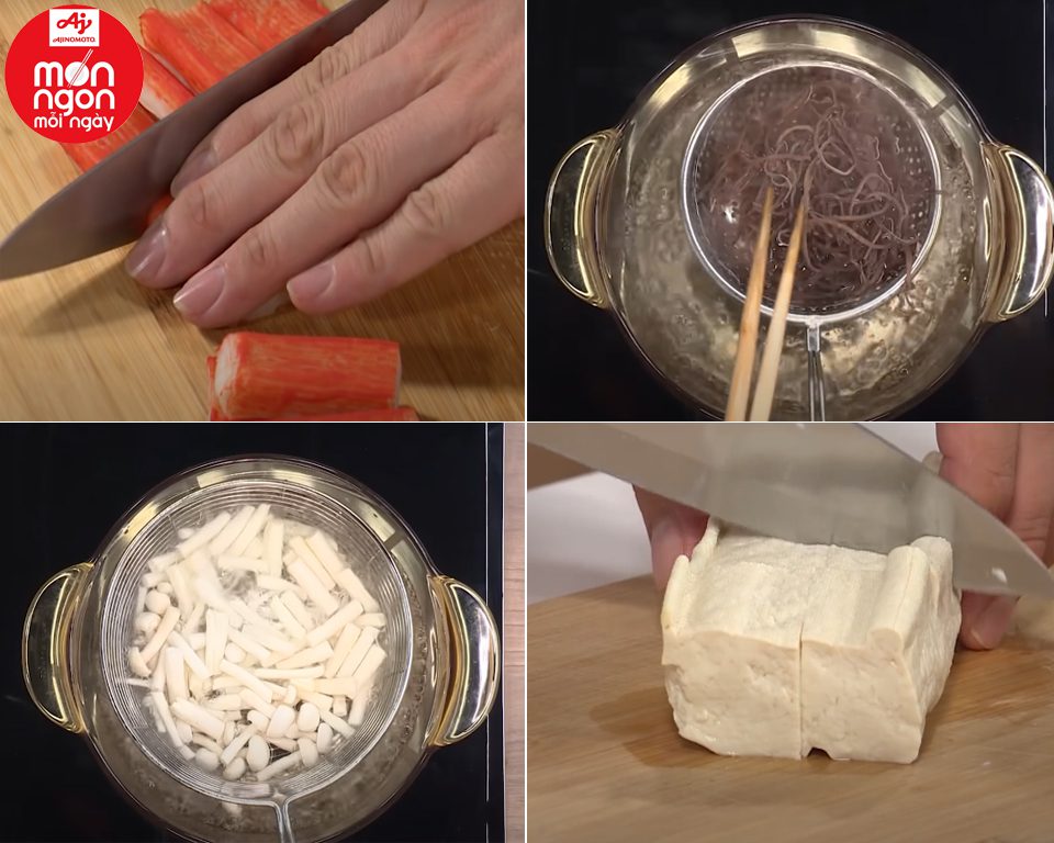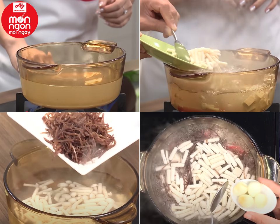 • Cho nước dùng vào nồi, lần lượt cho thanh cua, nấm hải sản trắng và mộc nhĩ vào.